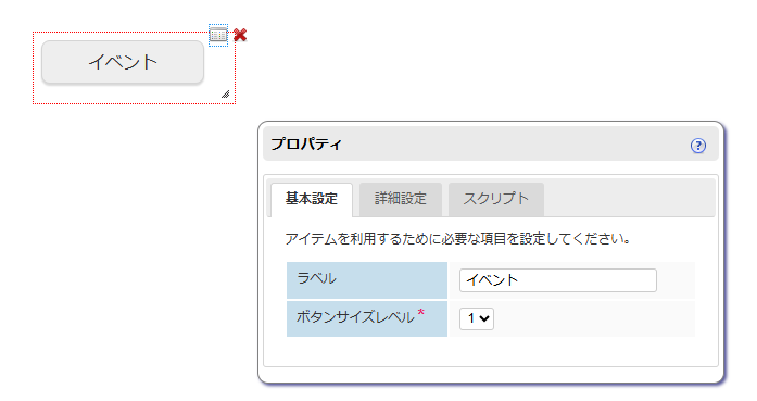 - イベントボタンのスクリプトタブを開き、以下のようにスクリプトを書き込む