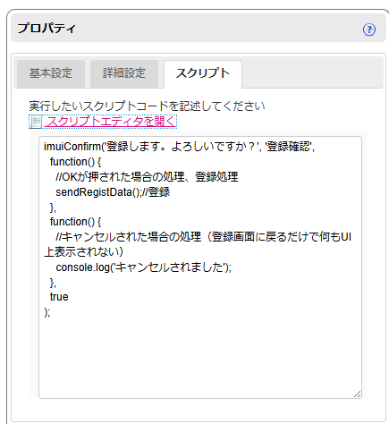 ここが今回実装時の初歩的かつ重要ポイントで、標準で準備されている登録ボタンだとアクション設定のカスタムスクリプトに対して、何を書いても強制的に登録実行がされます。(ダイアログが出ながらそのまま登録実行され1つ前の画面に戻ります。)