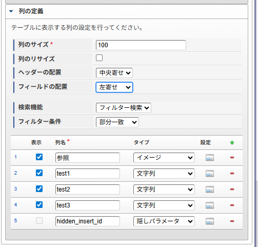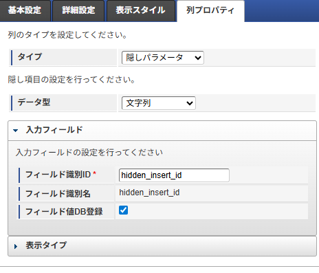 ここではimfr_sd_insert_idは表示の必要がないため、隠し項目として定義しております。