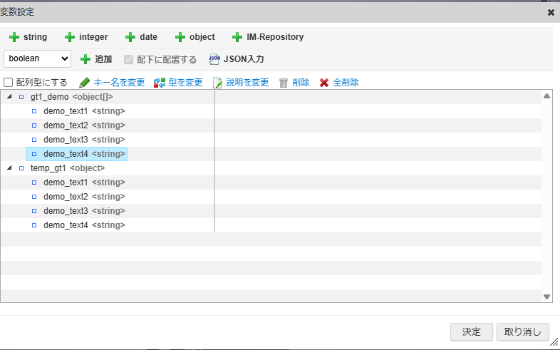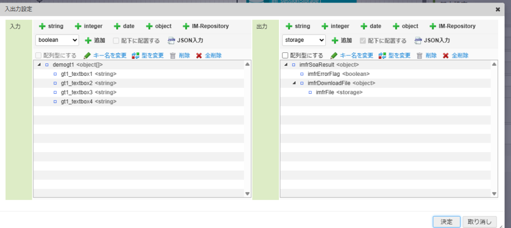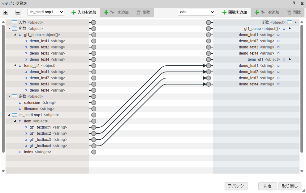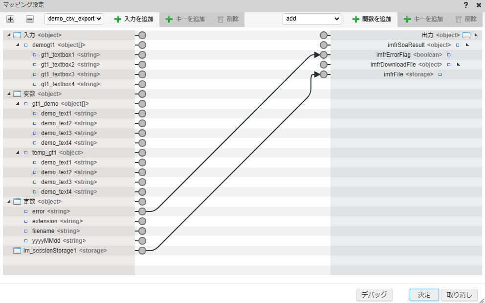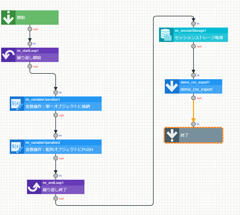 本事例では、あえて入力値とCSV出力値の定義を一致させておりません。配列をCSV出力定義に入れる場合は、オブジェクト名は一致してなくてもいいですが、配下の各定義は完全一致していないと値が設定されません。その一致していない前提の配列PUSHロジックです。