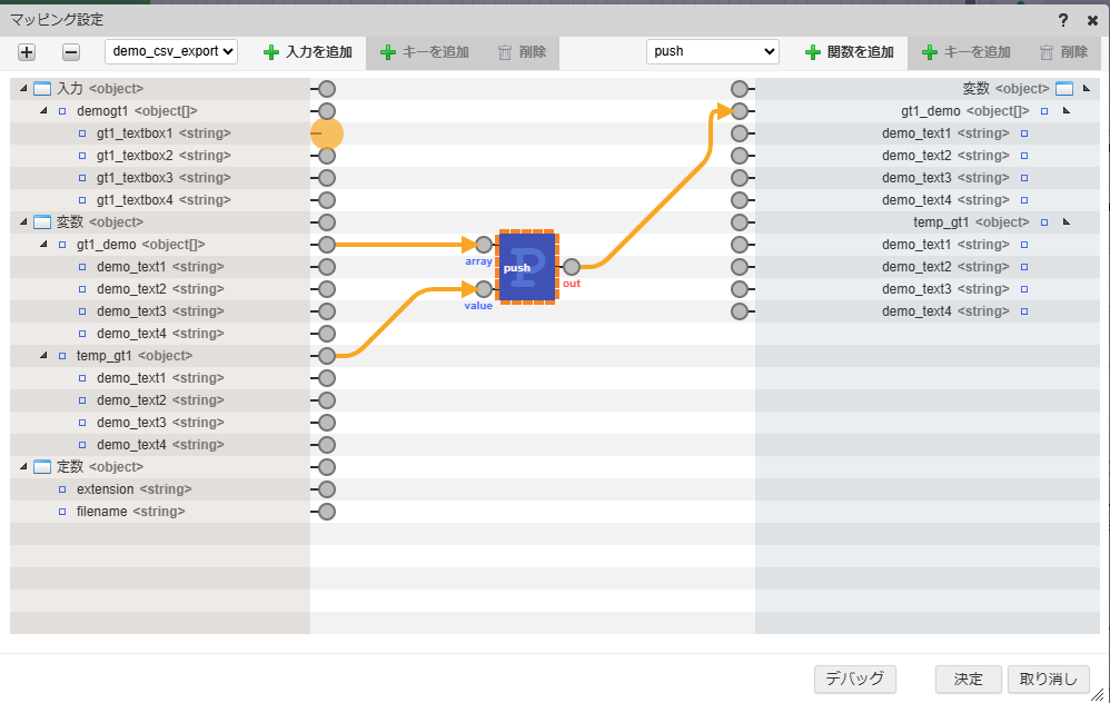 (必要なら)入力値の定義名とCSV出力定義のカラム名・型が異なる場合、push関数でカラム名・型を合わせにいく