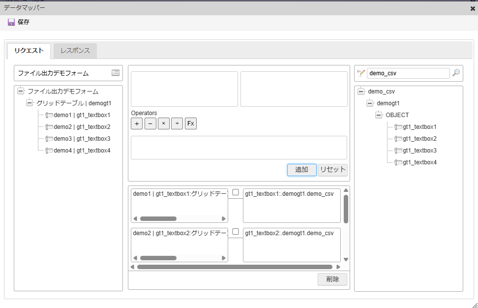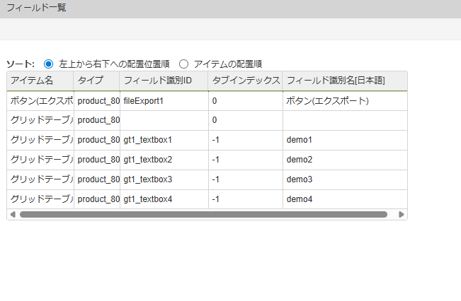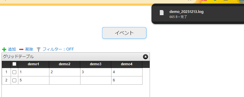 以下のとおり、エクスポート元となるデータはグリッドテーブル、ファイル出力にはイベントボタンとセットします。