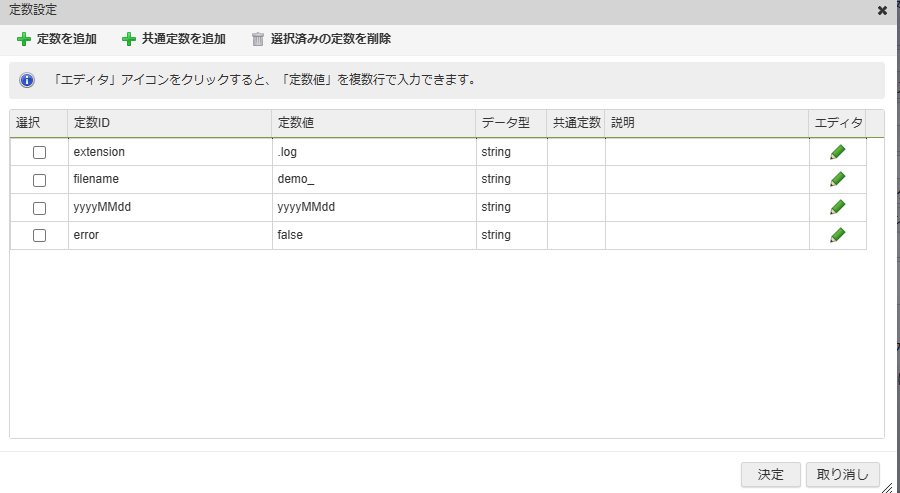 ここでファイル名を指定します。今回はdemo_${処理年月日}.logとして、処理年月日の部分を可変としております。