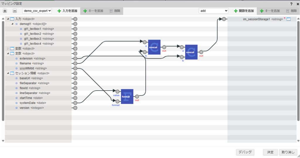 concat関数で任意のファイル名を連結し作成します。最終連結結果をセッションストレージ取得の入力値にマッピングします。
