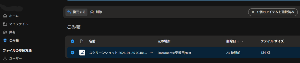 - 復元したいファイルまたはフォルダを選択し、「復元する」をクリックします。
