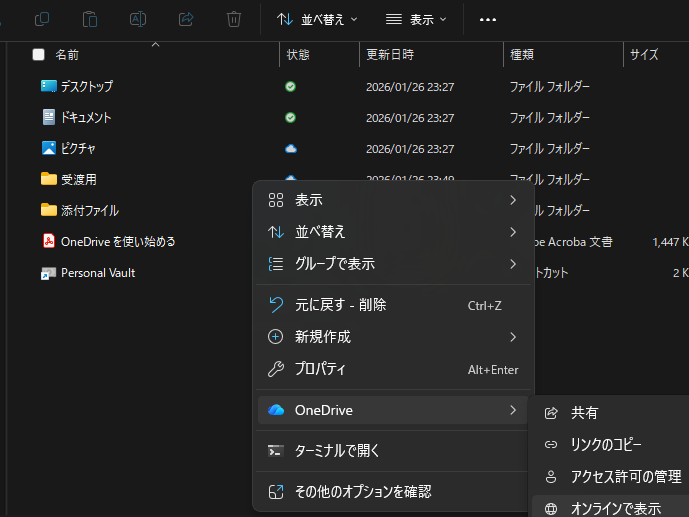 - 「OneDrive>オンラインで表示」をクリックします。