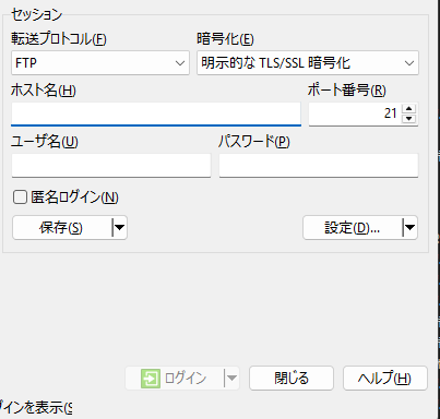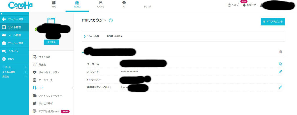 - ユーザ名:ConoHaWINGのFTPのユーザ名
